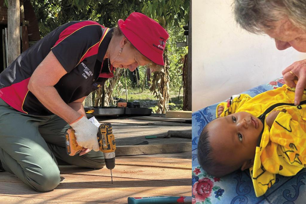 PICTURED FROM LEFT TO RIGHT: Rotary Club of East Maitland member Carol Coffey hard at work on the tools. / Judy Hicks, of the Rotary Club of East Maitland, shows her motherly instincts during a health check on a local baby.