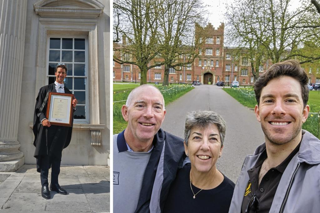PICTURED FROM LEFT TO RIGHT: Rotary scholarship recipient Scott Robinson graduated from the University of Cambridge in 2024 with a Master of Law. / Scott with his parents Rodney and Paula Robinson in front of Jesus College at the University of Cambridge.