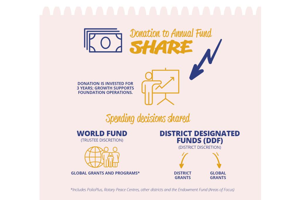 SHARE: The most popular option. Your donation is split – 47.5 per cent goes to the World Fund, 47.5 per cent to your district’s District Designated Fund (DDF) and five per cent supports administrative costs.